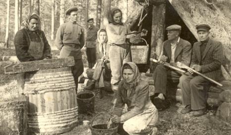Conifer sap collection. Solovyov, Nizhneudinsk district, Irkutsk region (Photograph, Anonymous, 1950). Source: Museum of Occupations and Freedom Fights.