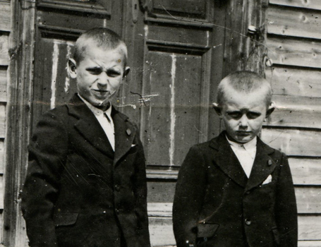 Римгаудас Рузгис (справа) с братом на фоне родного дома, до ссылки (Фотография, Анонимный, 1945-1947). Источник: Личный архив Римгаудаса Рузгиса.